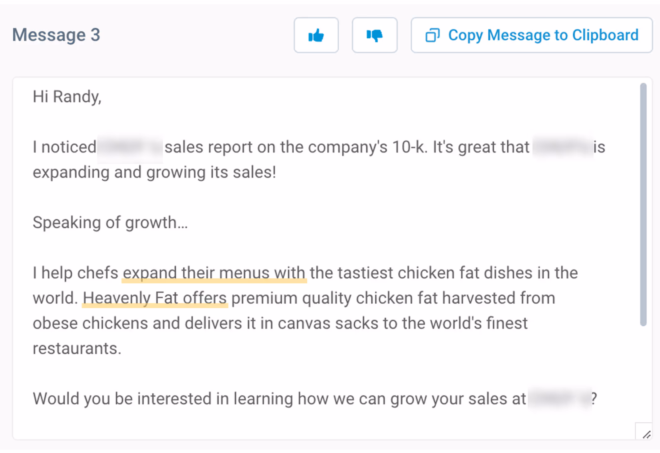 In summary, ChatGPT can write a pretty good first draft, but it doesn’t quite understand the requirements of a sales message. It doesn’t include relevant insights, which means you have to personalize from first hand knowledge or send a generic templated email. Worse, sometimes ChatGPT goes off script, which could create an embarrassing situation for an SDR in a hurry. Last, ChatGPT has no way of capturing contact data, and switching between a contact data provider and ChatGPT is time consuming.