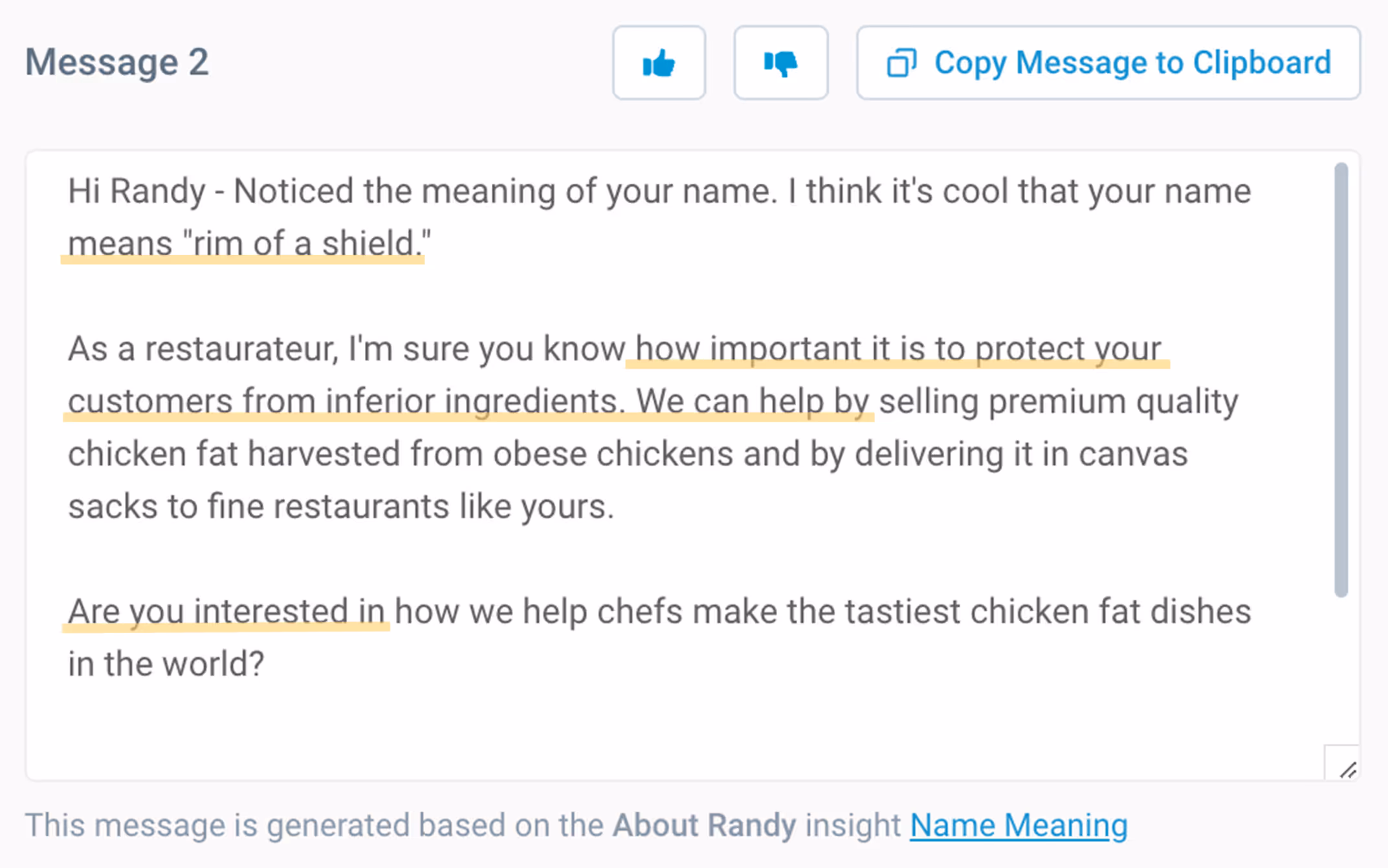 It's brief and to the point, personalized, and I get multiple subject lines to choose from. But there is some fat to trim (😉), and some of the syntaxes are awkward, so I spend one minute editing and arrive at: