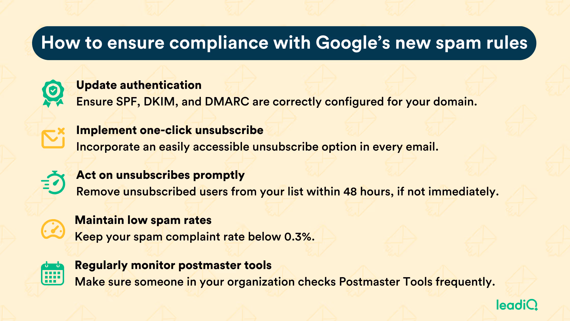 In case you’re unfamiliar, the rules require organizations to implement email authentication best practices, let users unsubscribe from mailing lists in one click, and remove those users within 48 hours. Additionally, companies also have to maintain a spam rate of less than 0.3% if they want messages to keep hitting inboxes.