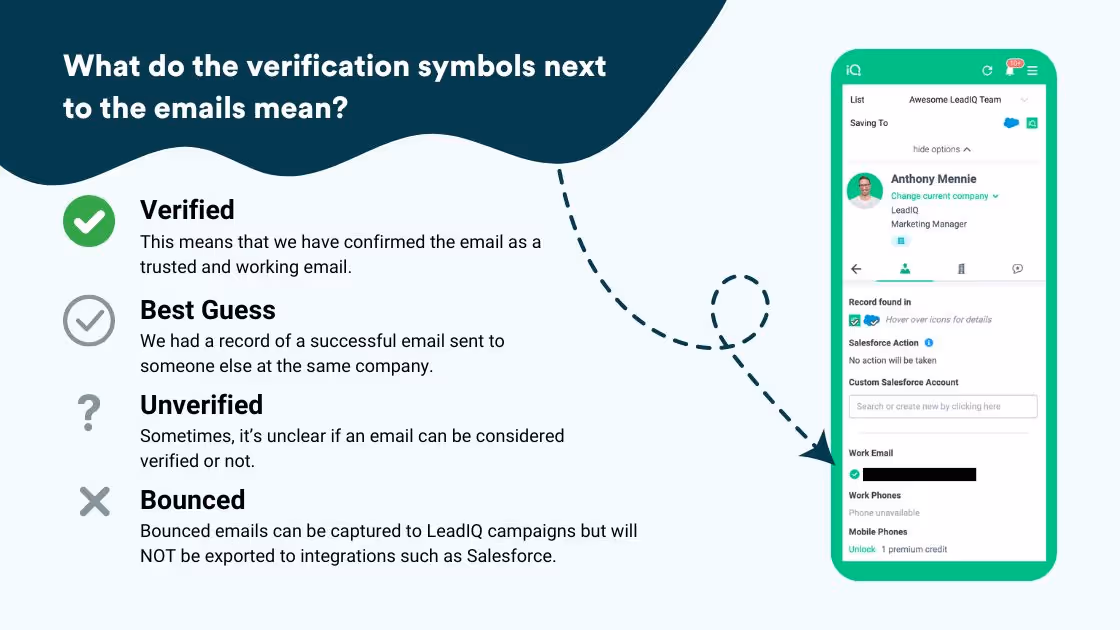 When LeadIQ finds a business email, our platform sends a request to the company’s server, resulting in a yes or no answer. When we get an affirmative response, we mark the email “verified” and put a green checkmark next to it, indicating the address is 95% likely to be accurate.