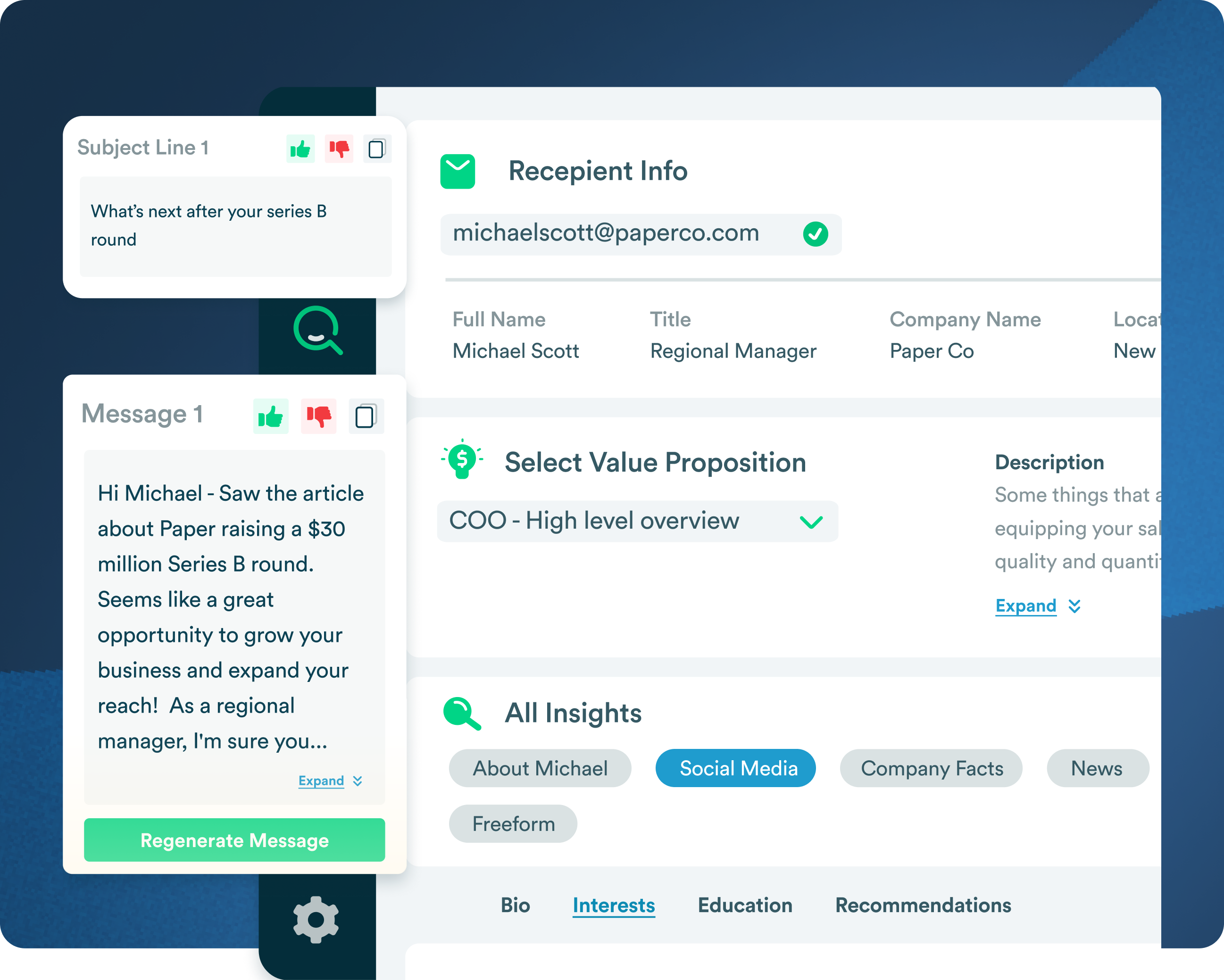 Use your persona information, your value propositions, and our insights to auto-generate three personalized messages. Write personalized emails in five languages: English, Spanish, French, German, and Italian.