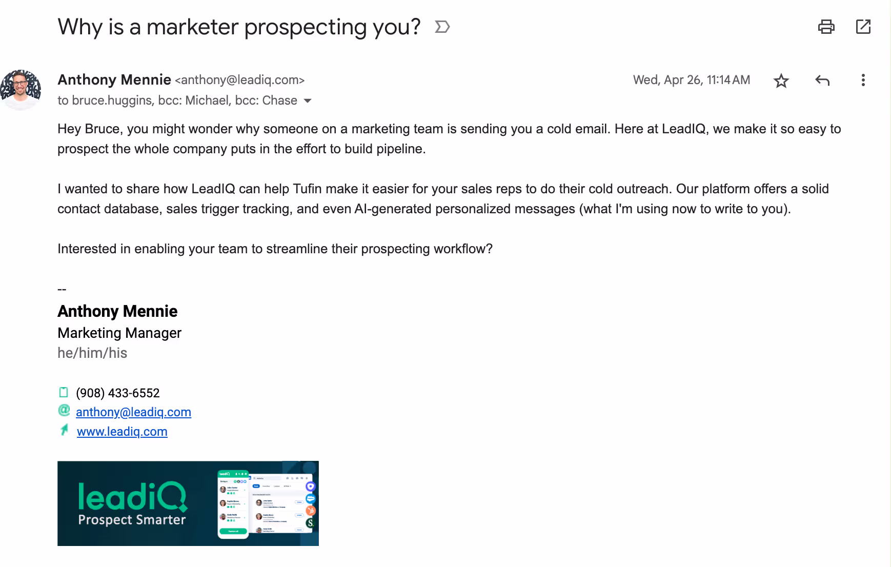 As part of LeadIQ’s Customer Zero program, we set aside a day each quarter when the entire company turns into sales development reps and account executives. This can result in some unconventional messaging, which can stand out in each recipient’s inbox (think: Why is a product developer cold emailing me?). As a collective effort, this can lead to fresh perspectives and the discovery of tons of hidden opportunities. On top of this, companywide prospecting days also help promote a culture of collaboration and shared responsibility for business growth, which keeps teams aligned and engaged.