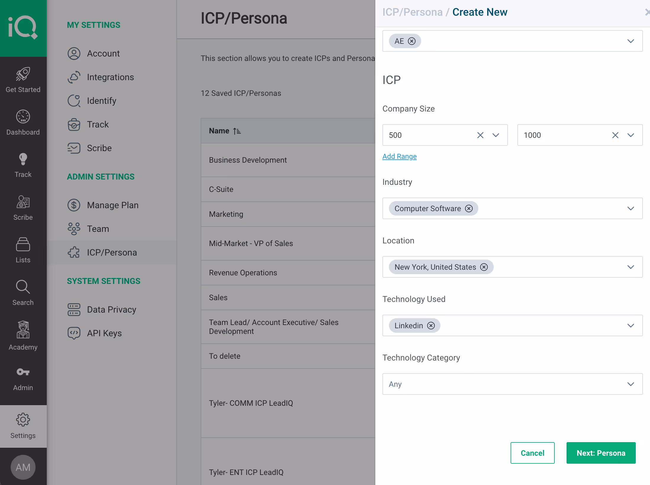 For example, LeadIQ lets you define your ICP and personas directly with our platform so they’re always accessible. This helps keep reps on track and efficient when prospecting using our Advanced Search functionality. ICPs and personas can also be used within Scribe, our AI writing tool, to generate messages that resonate while ensuring sellers stay on message — all within a few clicks.
