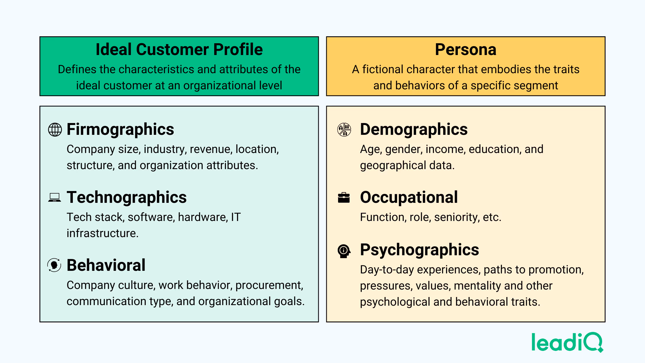 On one hand, an ICP for sales defines the characteristics and attributes of the ideal customer at an organizational level, providing a broad overview of the target audience. This might include technology companies with between 100 and 500 employees and $20 and $50 million in revenue each year, for example.