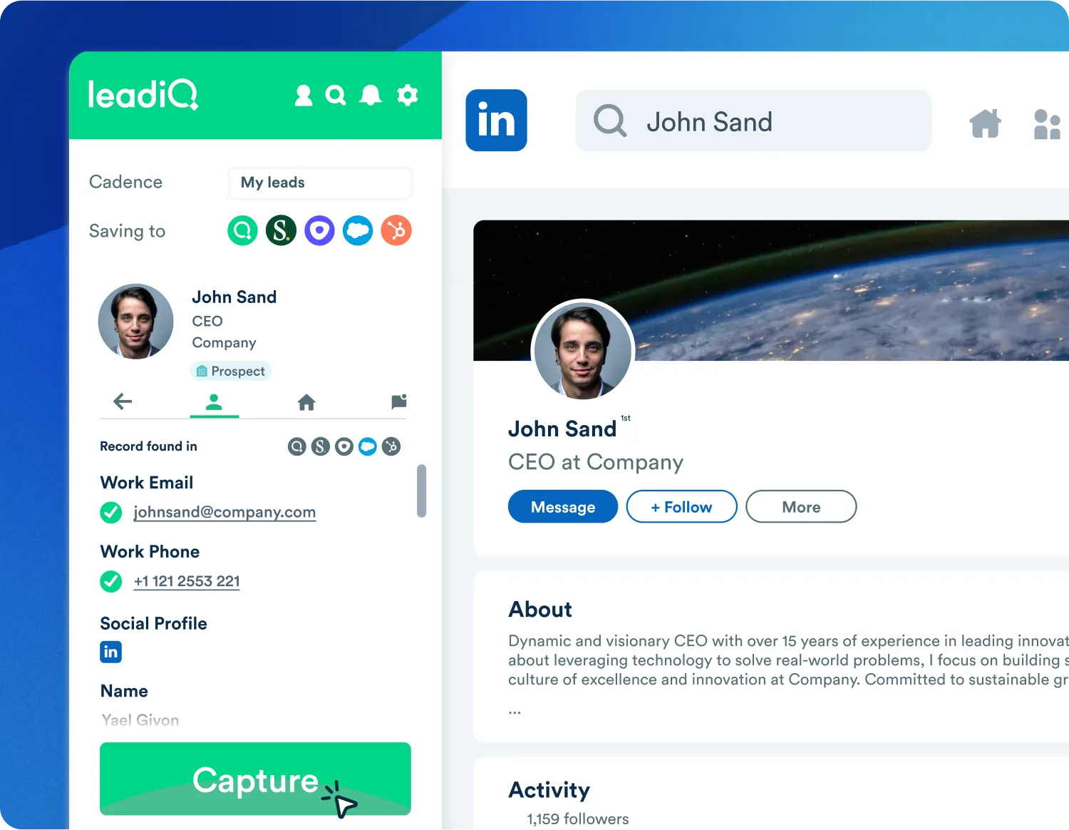 LeadIQ makes it incredibly easy to go from looking at leads on LinkedIn or any other site to putting them into my CRM and my Dialer for immediate outreach.