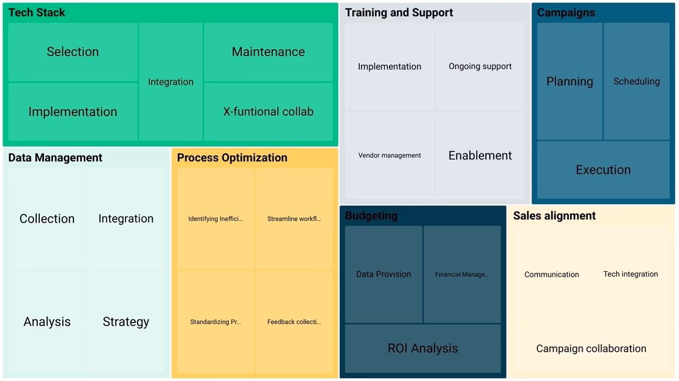 Some of the ops function’s most important priorities include designing and implementing processes, providing an integrated tech stack, and analyzing data so that the marketing team can unleash its full potential for the organization.