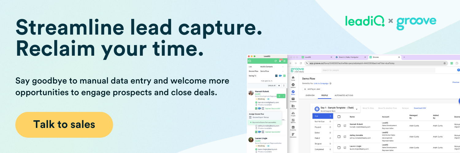 Ready to experience uninterrupted prospecting with LeadIQ’s Groove integration? Book some time to talk with one of our sales prospecting experts to learn more. Here's to more efficient prospecting workflows!