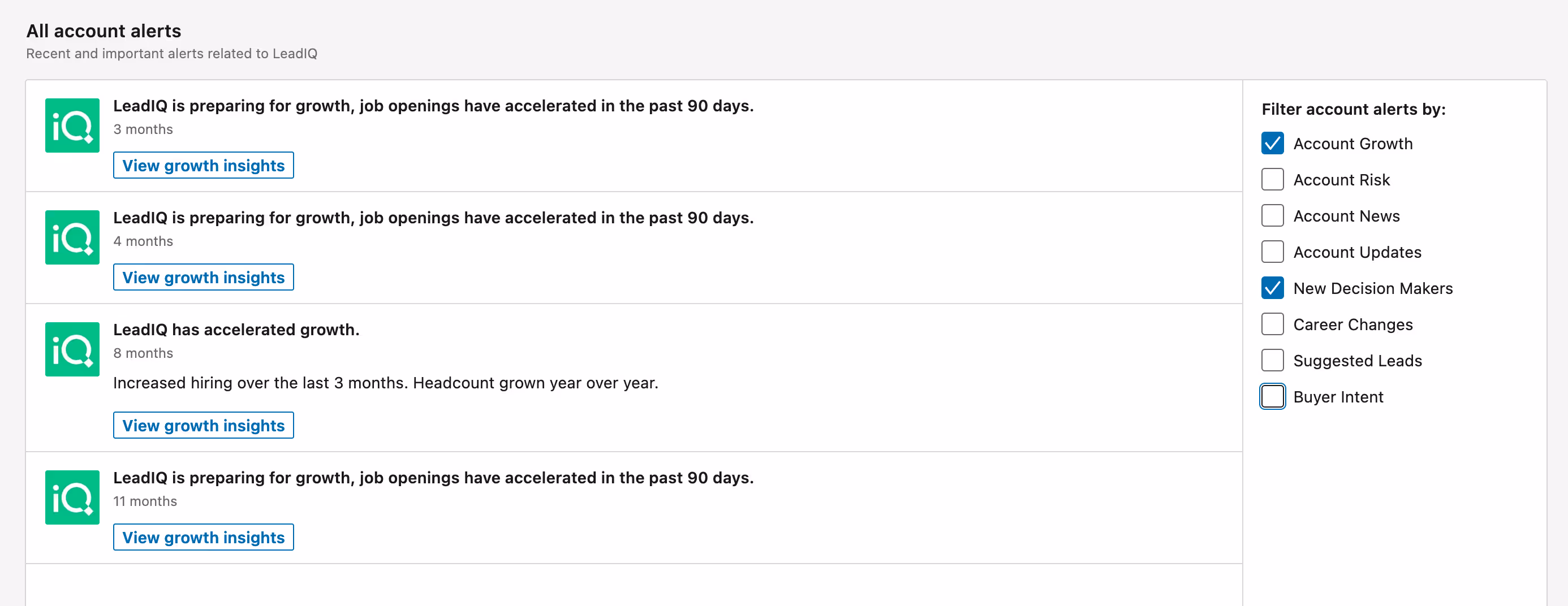Alerts are super useful — and accessible. On your homepage, click “Accounts” above your main feed for a directory of every account you’ve ever saved. Navigate to “Alert types” on the right side. You can tailor alerts to your saved accounts — making it easier to personalize your outreach. If you don’t know where to start, simply explore “Alert Types” for some inspiration.