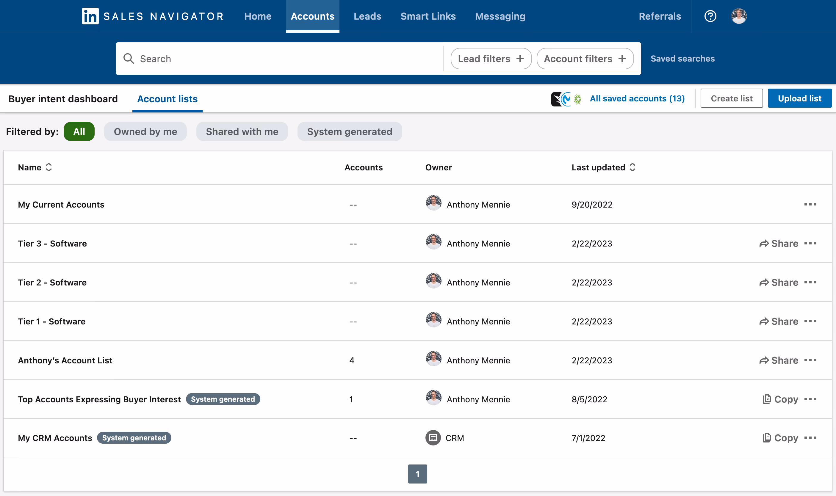 Yep, this again. Saved lists makes your alerts more effective, too. Receive activity updates on anyone who works at an account you saved. Or follow certain forms of engagement, like when someone at a company views your profile.