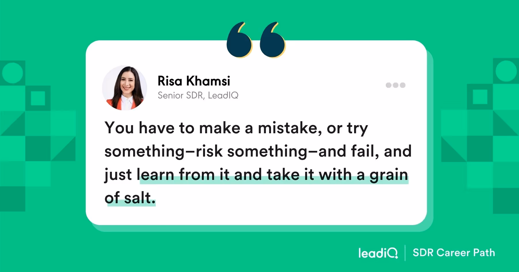 Be open to the non-linear path: Any career path (including sales) isn’t linear. Don’t be afraid of slow progress, or heading in the wrong direction altogether. That’s what Risa did, when a company recruited her from LeadIQ by offering a position that looked perfect on paper. That dream job, however, turned out to be a mistake. Risa returned to LeadIQ after six months. The detour taught her valuable lessons about what not to do, as well as to recognize that no matter how well you plan, things don’t always work out. Sometimes, she shared, you have to “make a mistake, or try something – risk something – and fail, and just learn from it and take it with a grain of salt.”
